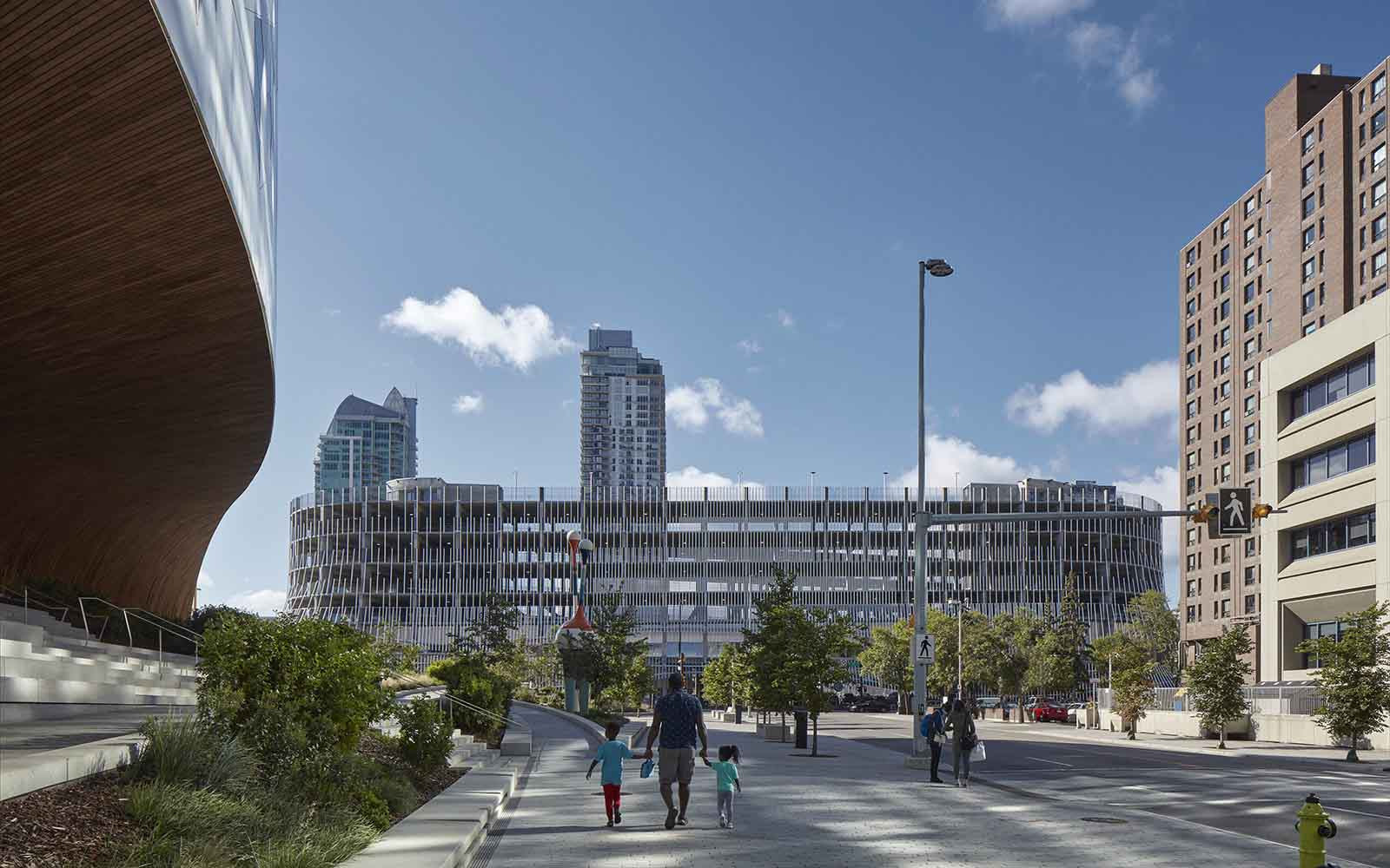 The project reimagines the role of the parkade in how we live, work, and play. Platform – a 50,000-square-foot innovation centre – welcomes start-ups and changemakers, proving the building is more than a place to park. Public amenities like a basketball court invite community use and activate the neighbourhood along 9th Avenue.