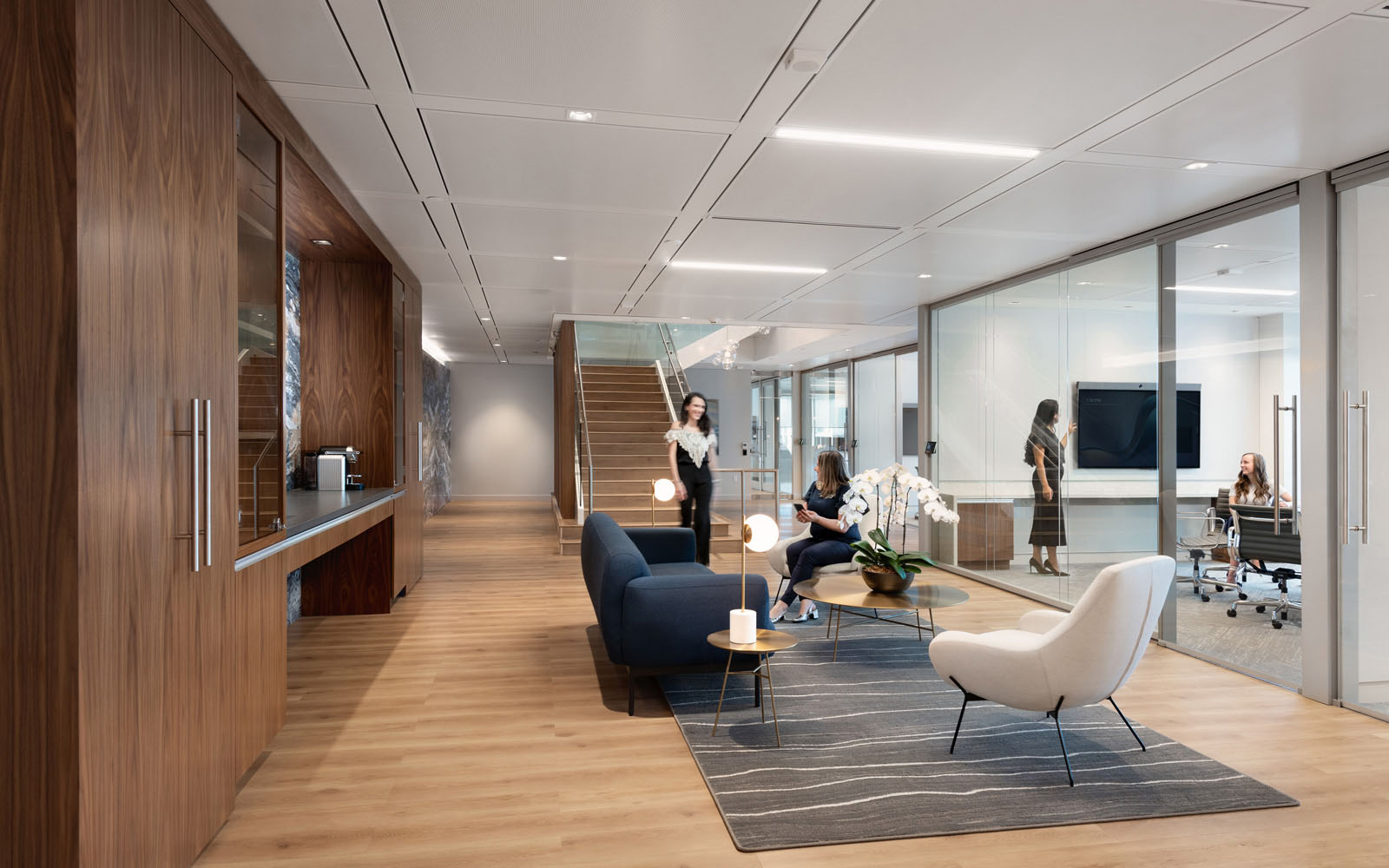 The reception and glazed meeting rooms are oriented to the west to take in ocean and mountain views. The main boardroom features an oval-shaped conference table with integrated technology for all meeting participants. Open and accessible areas such as the café serve as extensions of the workspace and act as social and cultural hubs with reconfigurable seating for both work and social gatherings events.