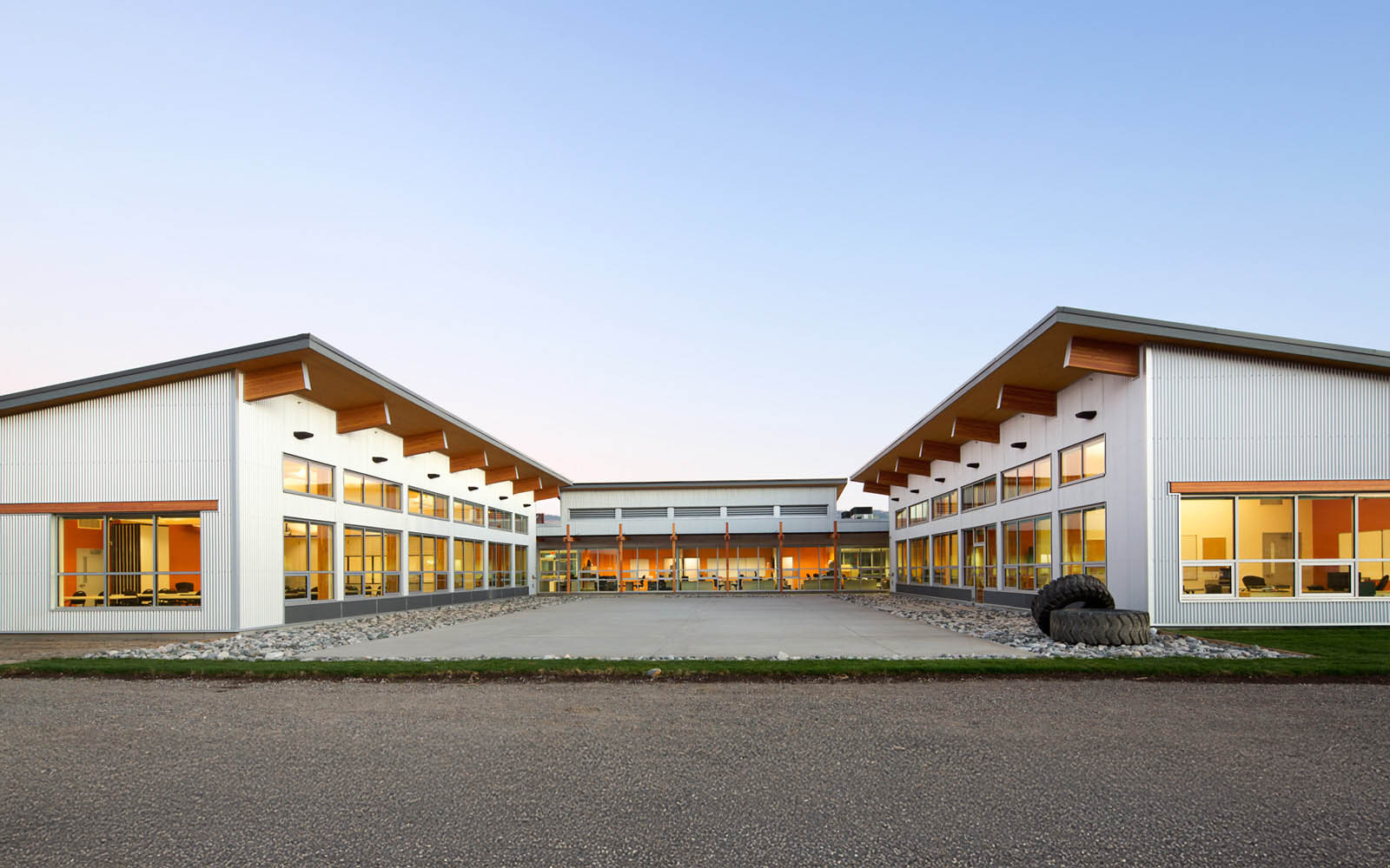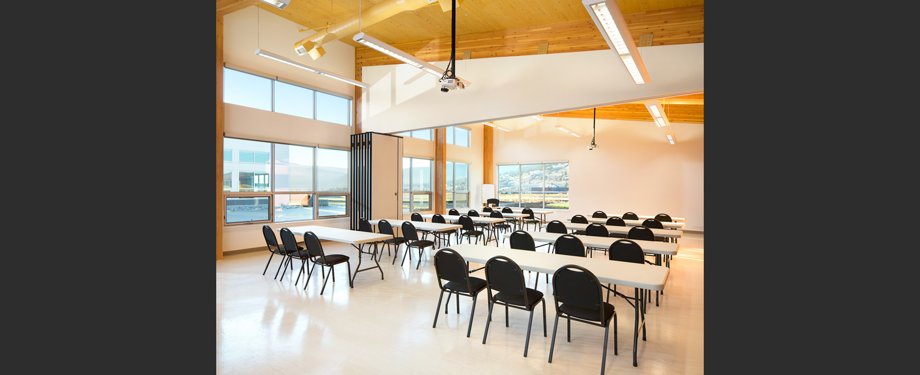 At the heart of the building is a central courtyard that operates as both a training ground and a communal space. Accessible and flexible, it supports a range of uses from instruction to team building to recreation. Its C-shaped form maintains key sightlines to the adjacent runway and helipads while mitigating Merritt’s prevailing southern winds. A commercial kitchen also helps feed the many fire crew members during peak wildfire season.