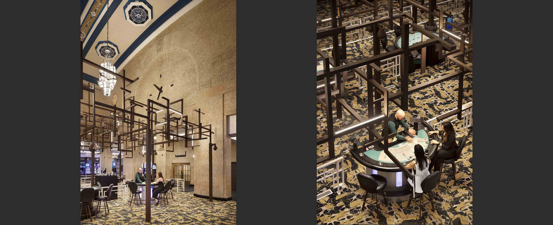 Historic features such as the station clock, chandelier, departure signs, and ticketing booths were retained. Close collaboration with the heritage officer built trust with both client and community, ensuring a design that honoured the past while supporting the casino’s future.