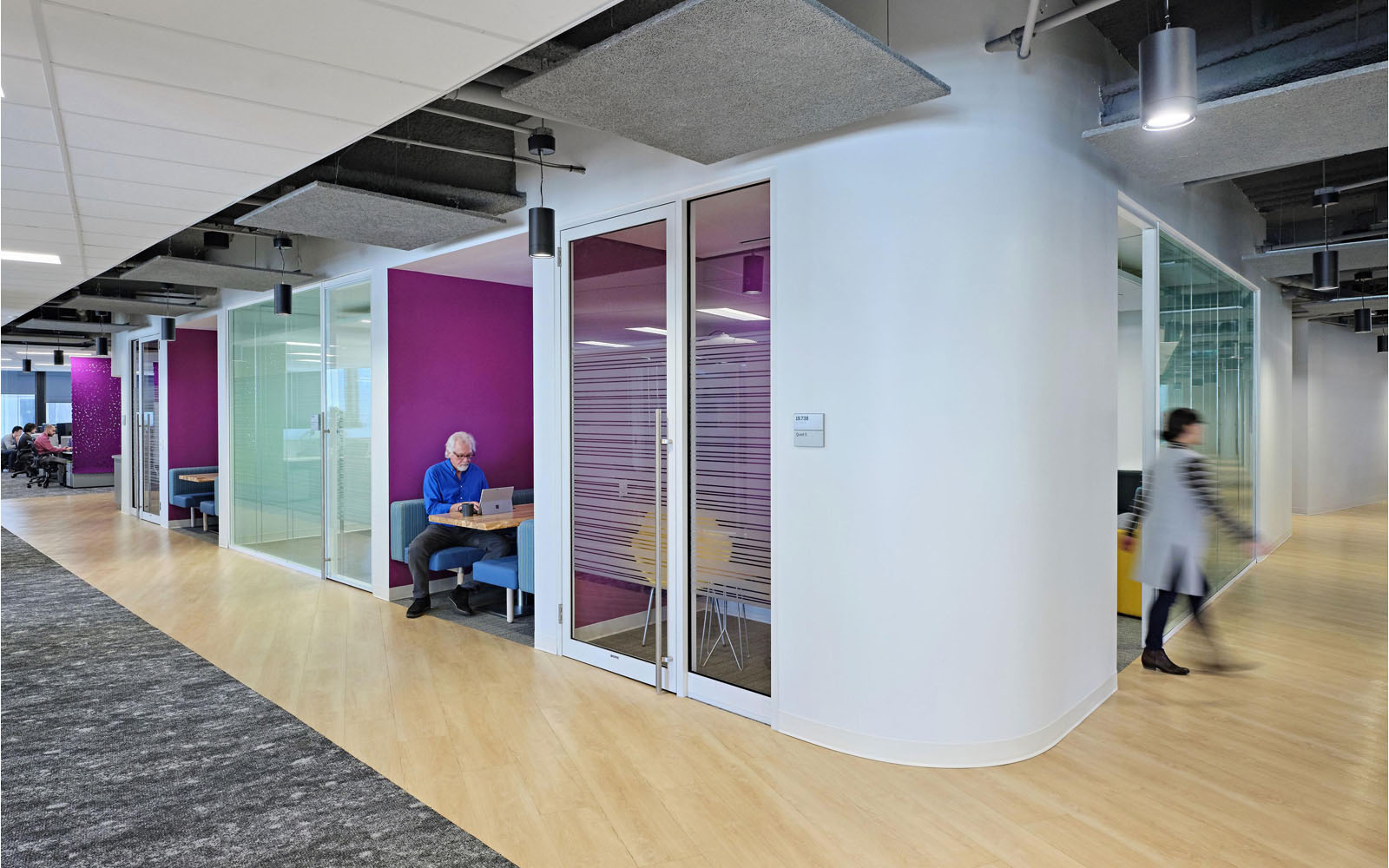 Kasian worked with SAP and CBRE to develop a flexible and innovative environment across three full floors connected by an internal stair. The planning strategy places the majority of workstations in an open configuration, including hoteling and visitor stations, supported by a network of collaborative zones. The remaining areas contain private meeting rooms and enclosed breakout spaces.