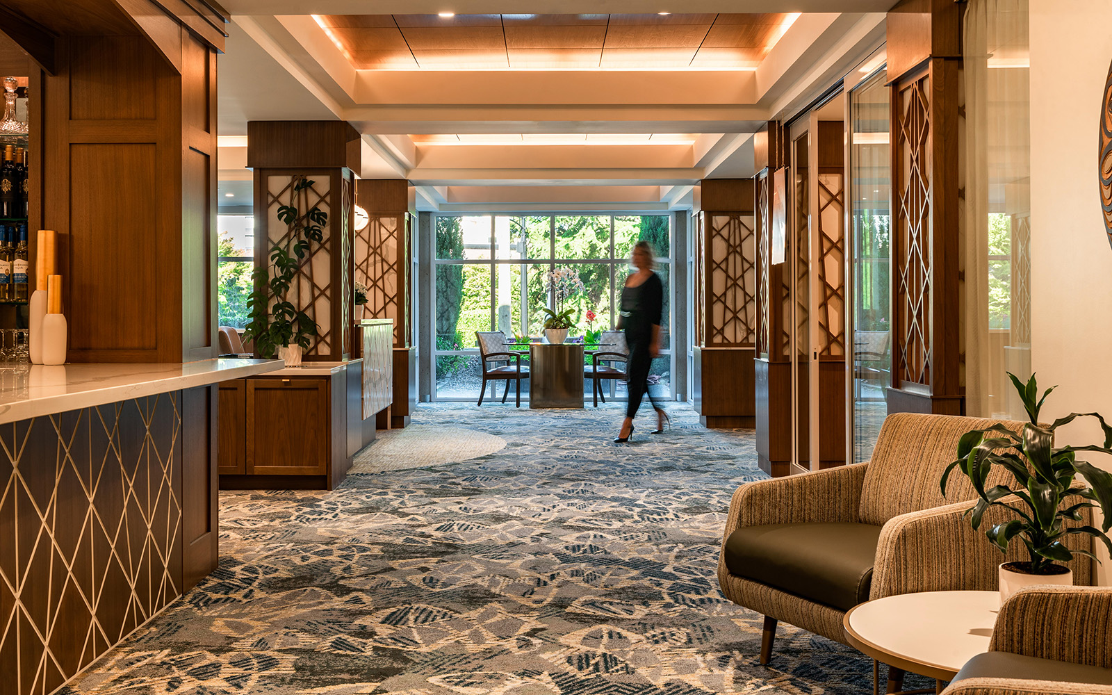 The design of Hollyburn House, a luxury senior living community, combines the North Shore’s natural beauty with the classic presence of the Lions Gate Bridge. The Westcoast Design movement has been particularly influential on Vancouver’s North Shore: the rainforests and mountains in this region, along with the wet climate, rocky, mossy terrain and the beach informed the colours and textures of Hollyburn’s interior.